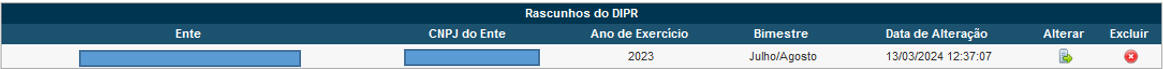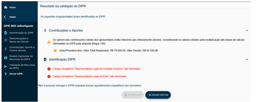 Observa-se, na tela acima, na última linha, a informação de que não é possível entregar o DIPR enquanto houver apontamentos impeditivos (em vermelho). Neste caso o usuário deverá informar os campos obrigatórios e, ainda, verificar os demais apontamentos para corrigir as situações que se fizerem necessárias. Apenas os dados em vermelho serão impeditivos. Ainda que haja, por exemplo, repasse menor que o devido, o sistema irá fazer o envio, porém irá ativar a regra de irregularidade correspondente.