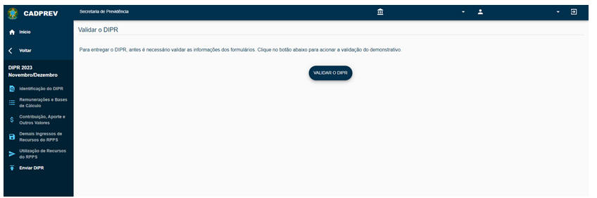 Ao clicar sobre a guia Enviar DIPR teremos a tela abaixo. O usuário deverá seguir a orientação e clicar no botão VALIDAR O DIPR para acionar a validação do demonstrativo.