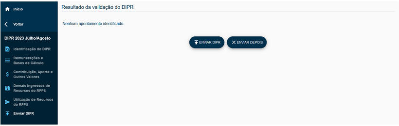Após a correção das informações, com nenhum apontamento identificado no resultado da validação do DIPR, o botão ENVIAR DIPR será habilitado, conforme tela abaixo, permitindo que o usuário possa clicar sobre o mesmo e proceder com o devido envio.