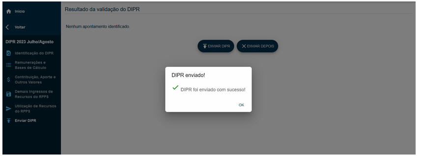 Por fim, ao clicar sobre o botão ENVIAR DIPR aparecerá a tela abaixo, com a mensagem: DIPR foi enviado com sucesso!