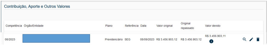 Valor devido da contribuição patronal apurado considerando as bases de cálculos informadas na guia Remunerações e Bases de Cálculo (Etapa 2) versus Valor original repassado da contribuição patronal conforme repasses informados na guia Contribuição, Aporte e Outros Valores (Etapa 3), nas referências PAT-SEG, 13-PAT-SEG, UG-PAT-SEG e UG-13-PAT-SEG, somado aos valores parcelados (DCP) no mesmo período, se existirem. |